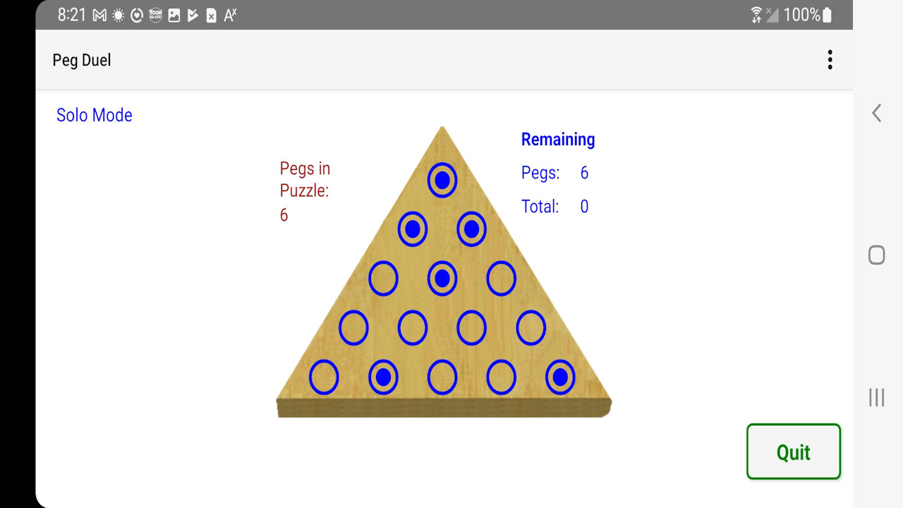 The goal is simple yet captivating: jump pegs on a triangular board to leave as few as possible behind. Peg Duel stands out with its customizable settings, letting players adjust the difficulty to suit their skill level. The “Number of Pegs” option (4 to 14) can differ for each player, making it easy to balance the game—say, a 5-peg setup for a beginner and a 12-peg challenge for a pro. The “End of Match Peg Count,” synced across devices in WiFi Mode, sets the win condition, adding strategic depth to every round.