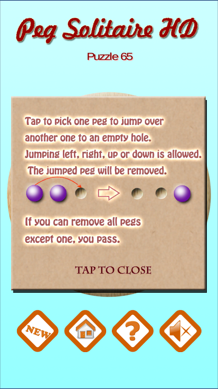 This app is more than traditional Peg Solitaire. Up to 80 puzzles based on classic English style are included, from very easy to quite difficult. You can solve it one by one, or just pick one randomly.