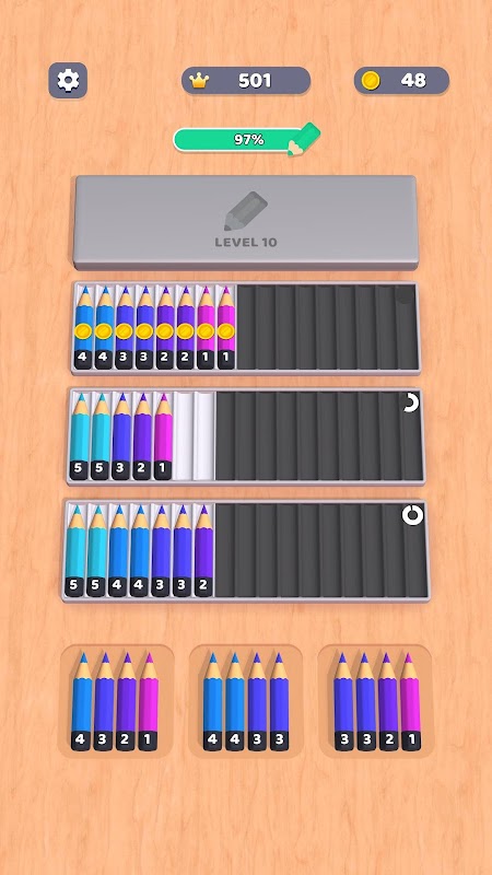The game's premise is simple: players must sort a variety of colored pencils into their respective containers by rotating and stacking them in a 3D environment.
