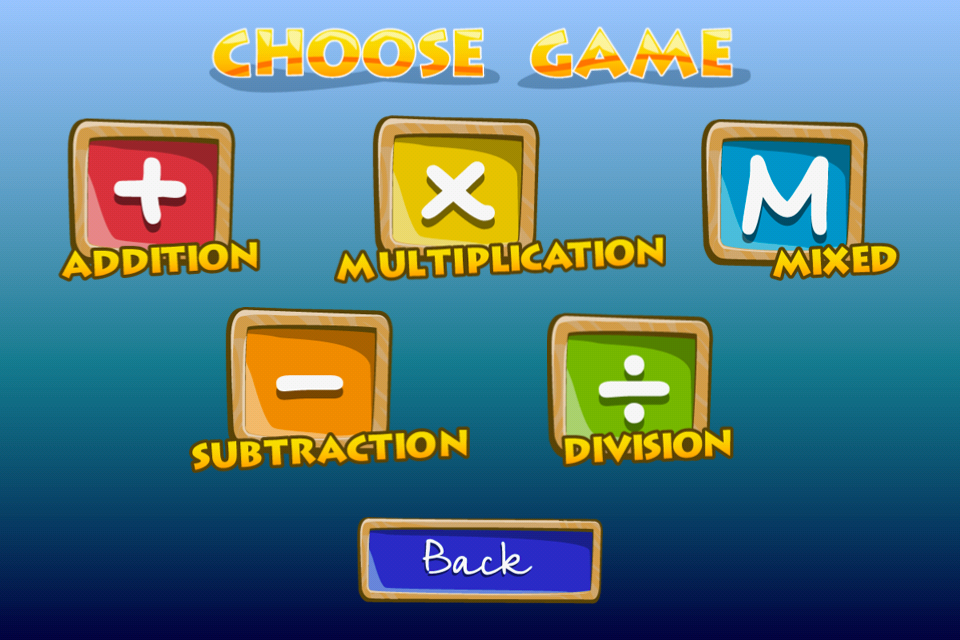 - Choose from 5 games: Addition, Subtraction, Multiplication, Division and Mixed
