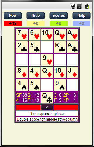 The objectives of the two games are, of course, quite different. For Word Pentad, the objective is to place the tiles so that they form words of two or more letters - either horizontally from left-to-right or vertically from top-to-bottom. The skill comes in how you use these letters to form words and to maximize the points scored. For Poker Pentad, the objective is to form poker hands, horizontally or vertically - a version of Poker Squares