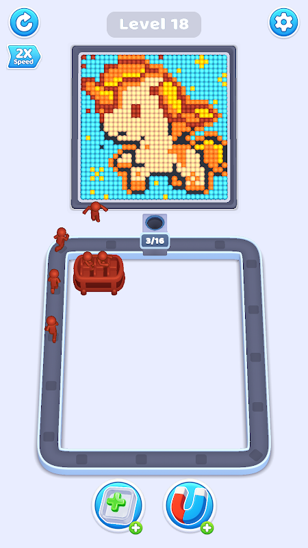 In this satisfying sorting game, your goal is simple: guide characters to the correct chairs by matching their colors. Arrange them carefully, fill the seats, and watch the picture above come to life as you progress through the level.