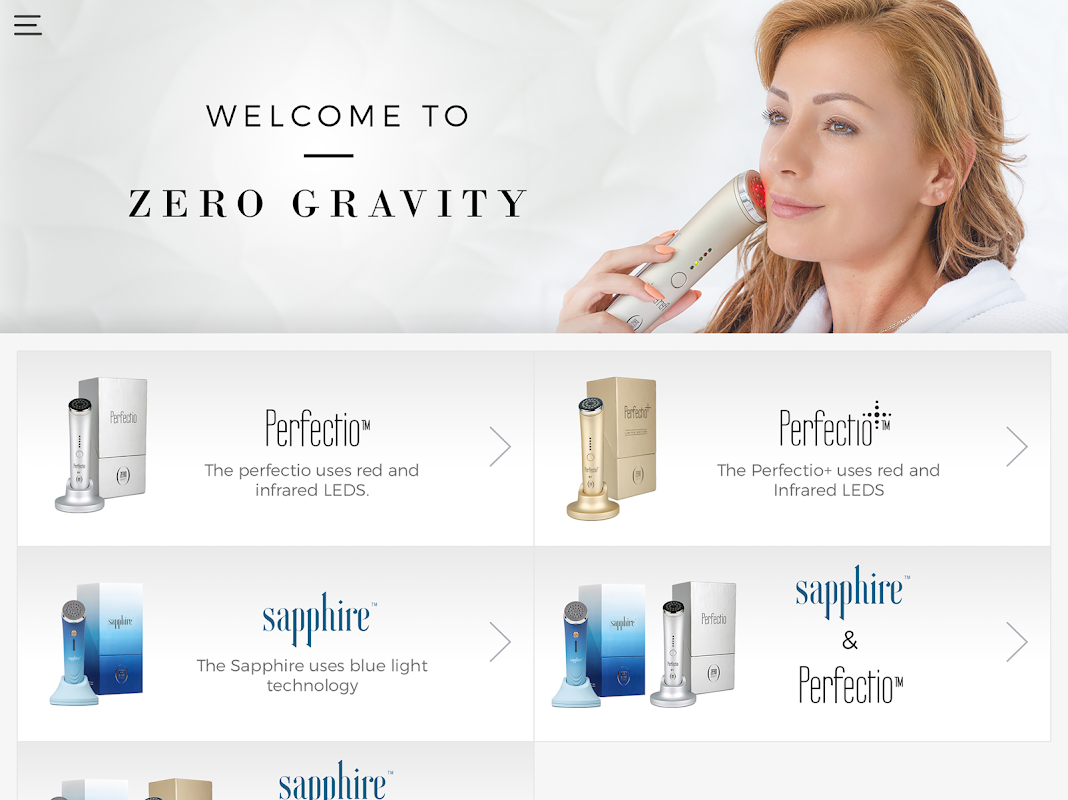 Zero Gravity's Perfectio app will create your facial treatment schedule and track its progress. Taking to account your age, skin type, wrinkle degree and gender, our application will a generate a treatment schedule to fit your needs. You can use the application to track the treatment time per each facial part while having the app displaying on the screen the exact section to work on. A quick access to our online guideline, videos, contact us information as well as having an option for social sharing.