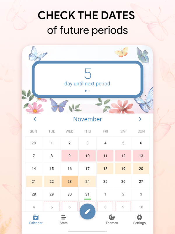 Period Tracker & Ovulation is a comprehensive and user-friendly application tailored to empower women in taking control of their health and wellness. This versatile app not only serves as a period tracker but also offers robust features for tracking menstrual cycles, ovulation, fertility, and birth control options. Our app presents you with a user-friendly calendar that excels at accurately predicting upcoming menstrual cycles, fertile windows, and ovulation days. It caters to those who find it challenging to recall their last period and to individuals keen on pinpointing their most fertile days for family planning. With its discreet and elegant interface, it offers a multitude of meticulously designed features to ensure you never overlook a pivotal date in your health journey.