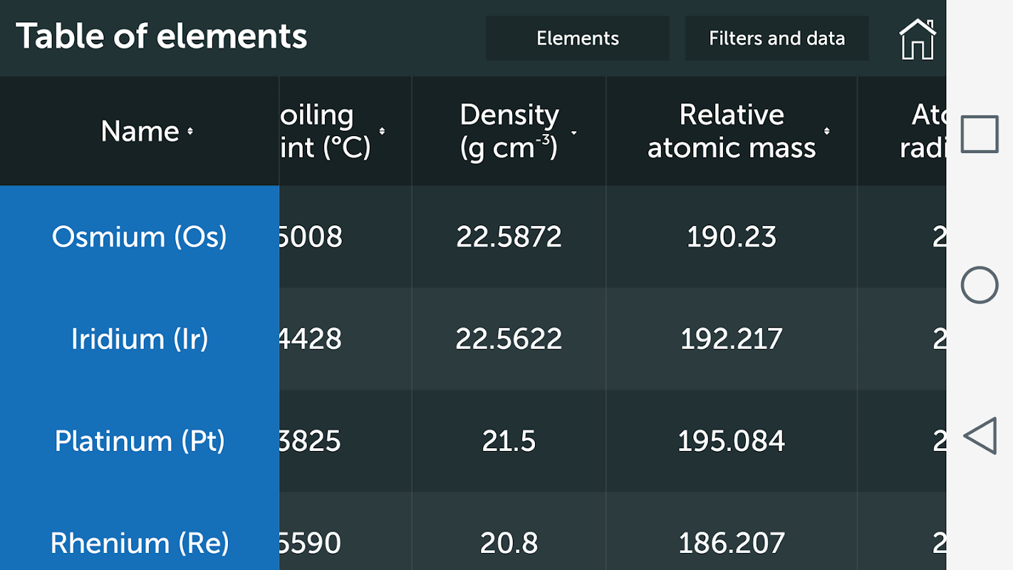 • Use our simple table for quick access to data – like sorting elements in order of increasing density.