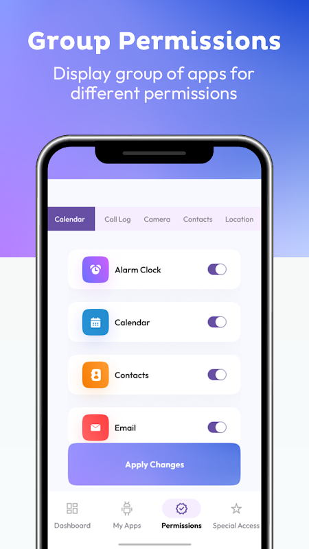 This application provide you easy option to control apps by permissions. Check apps with permissions to find a list of installed apps using this permission. Decide to enable a permission or disable with a single tap and apply changes.