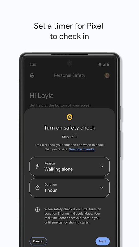 • Safety Check: Set a check-in timer for your phone to confirm you’re safe. If you don’t respond when the timer runs out, Emergency Sharing automatically starts. Also works with Google Assistant.