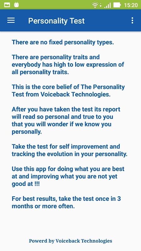 There are no fixed personality types. There are personality traits and everybody has high to low expression of all personality traits. This is the core belief of The Personality Test from Voiceback Technologies. After you have taken the test its report will read so personal and true to you that you will wonder if we know you personally.