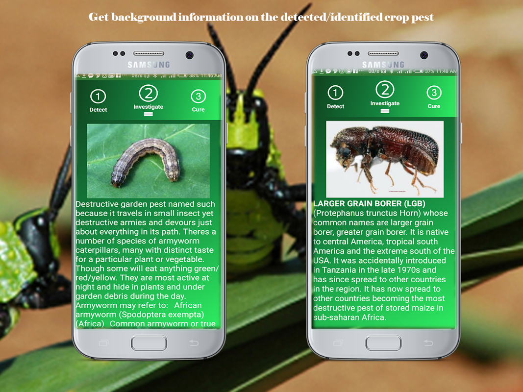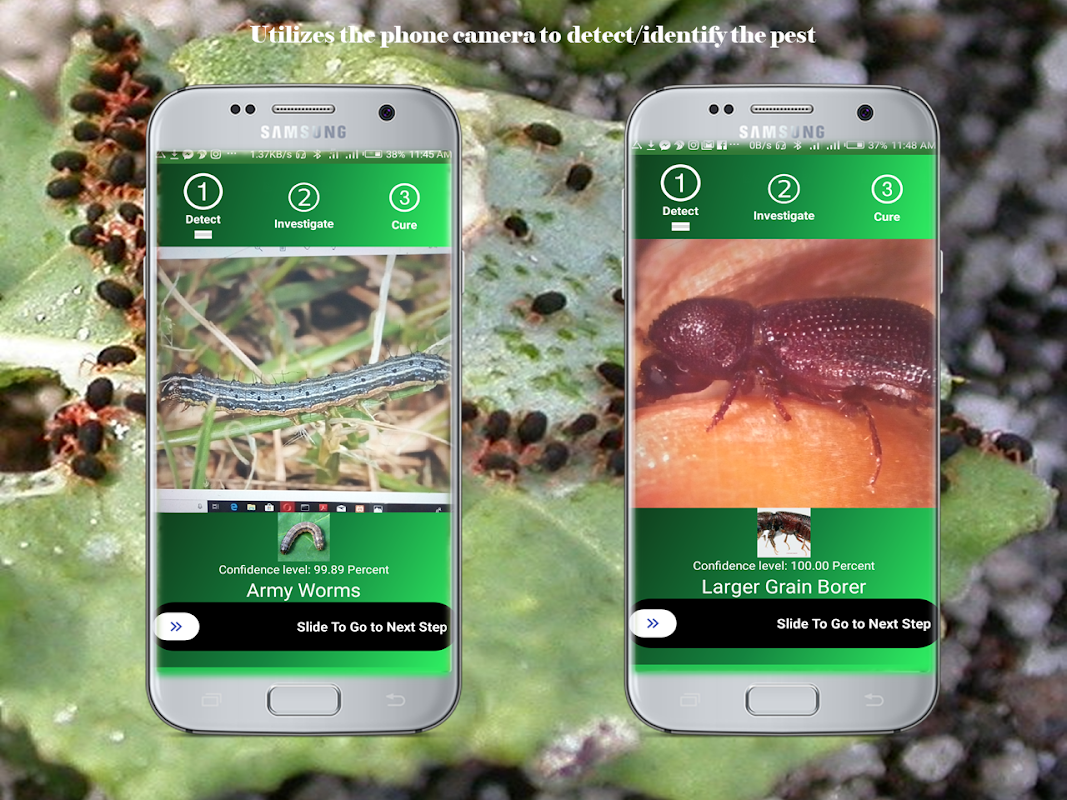 How does it work? The only thing you need is a Smart phone with a built-in camera. So you simply fire up the application, then point the camera on the location of the crop pest and once the pest is identified to a confidence level of over 97%, you swipe to the next step which gives you a background on the pest and eventually to the last step which gives you information on how to control the detected pest.