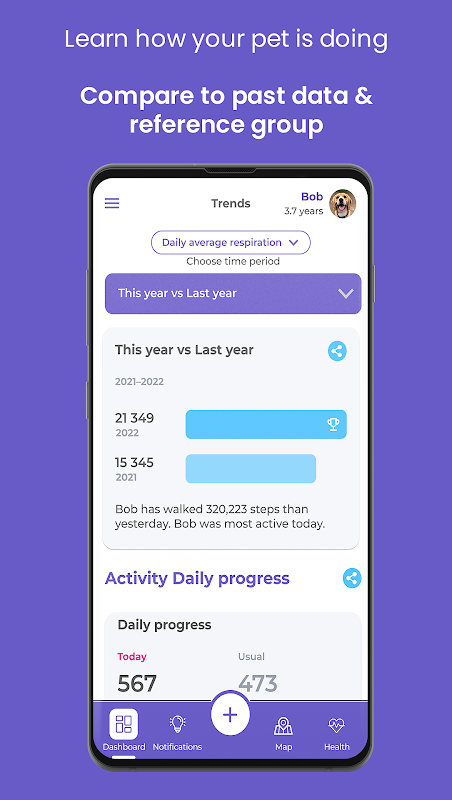 Health Profile - create a personalized baseline of your pet's physiological status and behavior routine for early detection of changes in health status.
