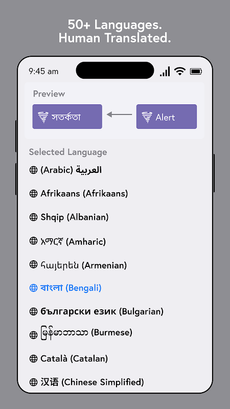 Every alert is professionally translated into over 50 languages to ensure clarity, accuracy, and accessibility for all communities.
