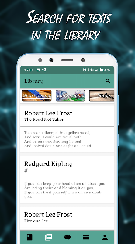 To make the search and adding texts easier, a library has been added to the application. There you will find the best verses, songs, fables and poems of great authors.