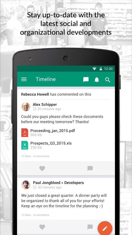 Share new knowledge, ideas and internal successes quickly and easily with the rest of your team, department or organization. Enrich messages with pictures, videos and emoticons. Simply keep track of new posts from your colleagues and news from your organization.