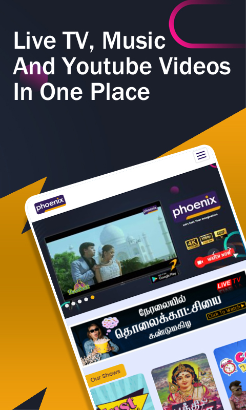 Phoenix Television is an Indian Tamil Language General Entertainment & Infotainment Private Broadcast Television Network that is Owned by Phoenix Creations. We do not charge user any fee and our service is completely FREE and available any time and can be accessed from anywhere with a internet connection and a android device.