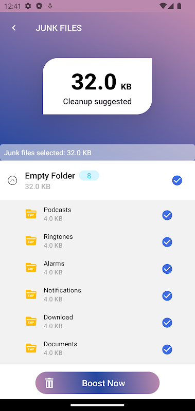 Junk Cleaner helps to analyze all the log files, temporary files, AD files, residual junk, empty files, big files and useless apk files after installment. Then it will recommend you to clean those junk files to release more space of your mobile phone.