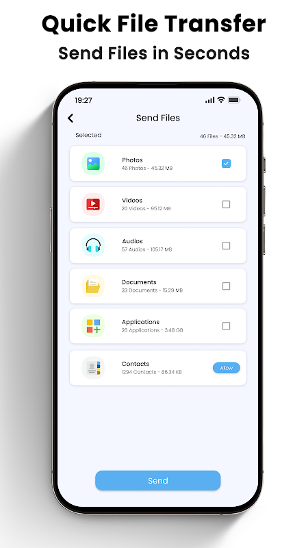 Want to send specific files? The smart file transfer feature allows you to select and share individual files like images, videos, apps, or documents from your phone to any other Phone. Quick and easy No Cables or USB needed!
