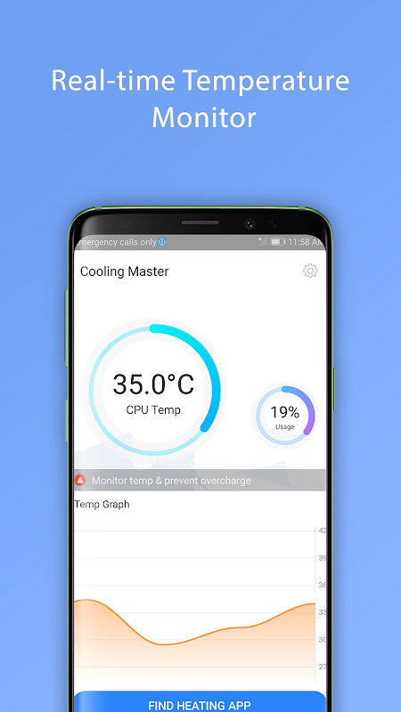 Monitoring your phone's temperature and displaying it on your phone screen will help you know when the temperature rises. Constantly controlling the CPU temperature and giving alerts when the temperature is high, it is easy to clean and boost and cool down phone.