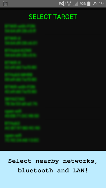 3. Select the target (nearby Bluetooth device, WiFi network, Local Area Network IP address) that you want to hack.