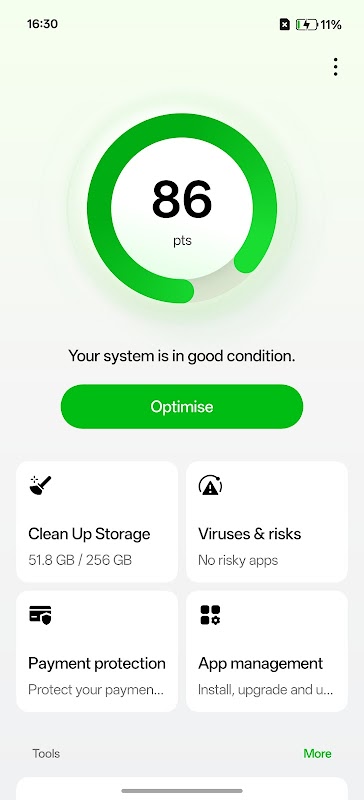 - One-tap optimization detects issues, cleans junk, and suggests quick security fixes.