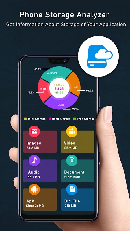 Phone Storage Analyzer & Disk Space Manage helps to free up disk space and bigger file you can directly delete in your mobile.