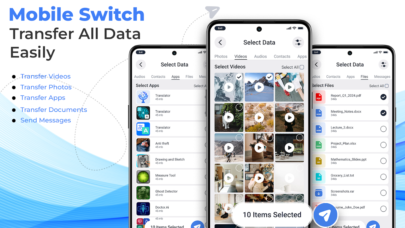 Transfer photos, videos, apps & files between phones—fast, secure & no cable.