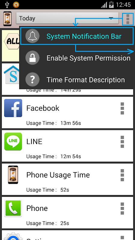 You can add a status bar to quick see APP usage time & quick launch APP.