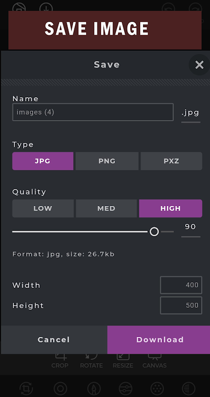 * Save images in JPEG, PNG, GIF, WebP and PDF