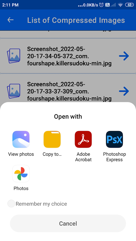 All the compressed images are store in external storage under the folder “PhotoByte”. In addition to that, the name of compressed images will be same to the original files. Just “-min” will be appended for easy differentiation.