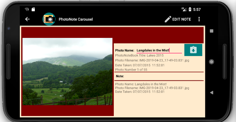 PhotoNoteBook™ is a fully functioning combined photograph and note manager for Android™ powered tablets and phones, unashamedly aimed at larger screened phones and tablet devices. PhotoNoteBook™ was designed with the needs of serious hobby photographers, students and fieldworkers foremost in mind.