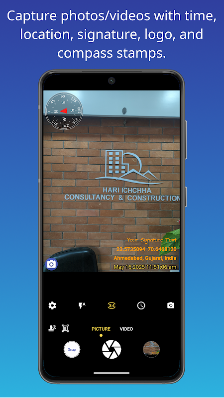 - Effortlessly add current time, location, logo and signature stamps as you capture photos and videos.