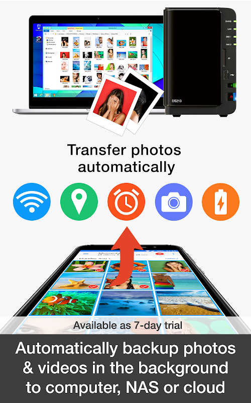 Wirelessly and automatically transfer, backup and share photos & videos between your Android devices, computer, iPhone, iPad, NAS, cloud and photo services. Any kind of transfer – PhotoSync can handle it!