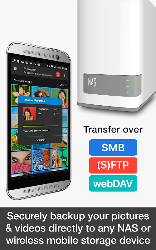 • Securely auto upload photos & videos straight from Android to your NAS, wireless mobile storage device or remote server over SMB, (S)FTP and WebDAV