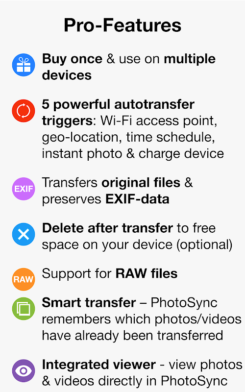 Wirelessly transfer, backup and share your photos & videos between Android devices, iPhone, iPad, Computer, NAS, cloud and photo services. Any kind of transfer – PhotoSync can handle it!