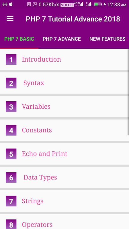 Every topic in this PHP tutorials application 2018 contains lots of practice examples that you can test yourself to extend your learning on the topic. The purpose of these examples is to provide you a better understanding of the usage of PHP in your day to day implementation.