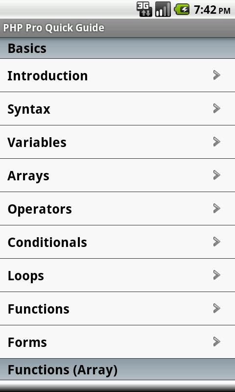 The PHP properties/functions are categorized and searchable. Each detailed information screen contains a description, syntax, parameters, examples, and more. In addition, most of the examples include the actual output.