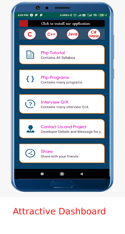 This is the only app in which you can learn the whole syllabus of PHP language with Tutorials ,programs and Interview questions and answers.