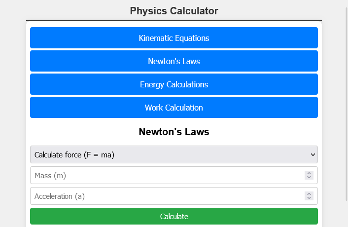 Understand and apply Newton's Laws of Motion with our intuitive calculator. From calculating force, mass, and acceleration to exploring the intricacies of inertia and momentum, the Physics Calculator app ensures you grasp the fundamental principles governing the motion of objects.
