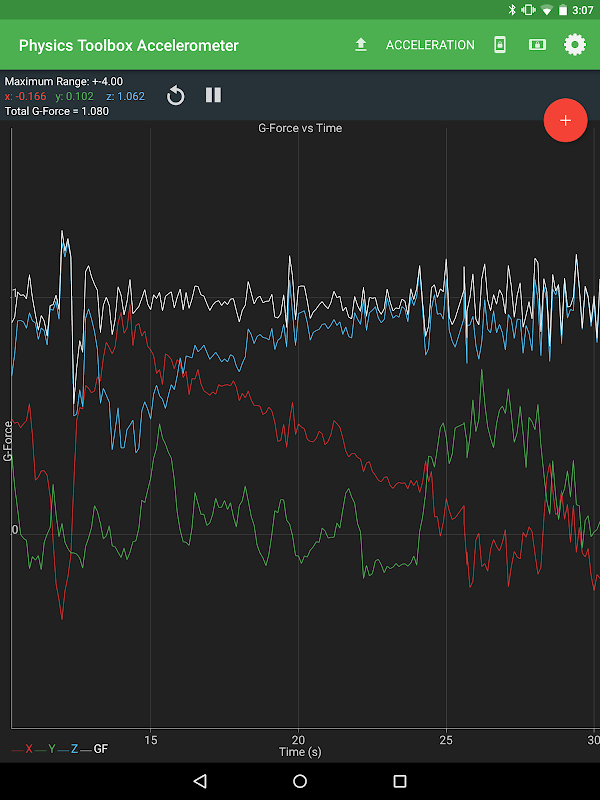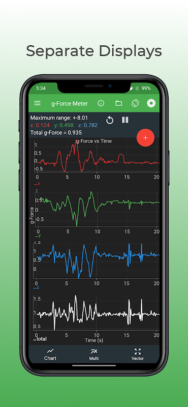 This accelerometer sensor app measures and displays multiple forms of kinematics (motion) data, including the g-Force Meter, Linear Accelerometer, Gyroscope, and Inclinometer. It displays relevant information in x, y, and/or z dimensions, as well as total magnitude in graphical, digital, and vector formats.