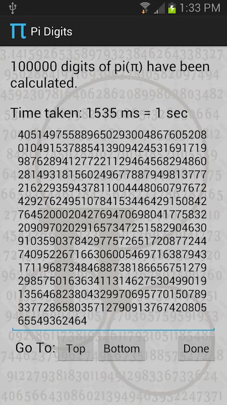 This app allows you to calculate the digits of the irrational number pi