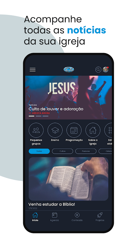Resources available in the Application: News, Church Calendar, Events, Content, Projects, Live Broadcast and Teaching Module.