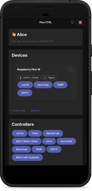 This lets you to control Raspberry Pi Pico W with easy no code set-up. Drag&drop .uf2 file to your Raspberry Pi Pico in boot mode, connect to wifi named Pico and set up your wifi + add secret generated from your app to sync control to the device. Set up some commands and enable them on desired devices. Click on created Device Control to launch the action 🚀