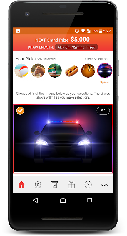 Once on the home screen you’ll find 60 images. Scroll through the images and tap on your favorites to select them and fill out your selection circles at the top of the screen. All images you see are potential images that will be drawn. Fill in ALL the circles of the selection section with a mix of STANDARD images and one SPECIAL image selection. Images are divided up into two pools- 52 “Standard Images” and 8 “Special Images”. Find all the game information (grand prize, draw date & time) at the top of the home screen. After the clock has reached zero head over to the results screen and watch all the different images be eliminated. The last 5 images left are the winning images. If you’ve matched any combination you win a prize! Match them all to take home the grand prize!