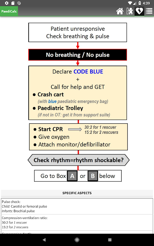 Additiontal functions: A body weight estimation tool is available to estimate the patient's body weight based on body length/height or age, according to local growth chart data. Additional reference information on management of paediatric cardiac arrest is available via the additional function buttons on the top-right corner.