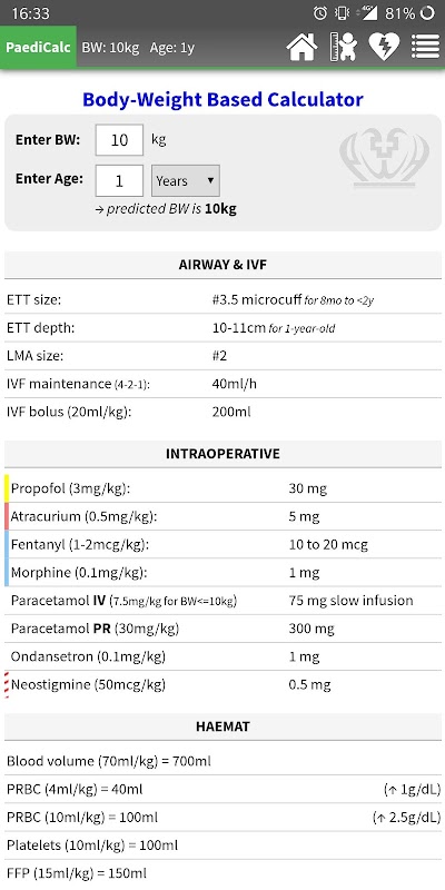 Instructions for use: Enter the body weight (range 0-50kg) and the age (0-10 years, with option to enter age in months or days). The information provided is self-explanatory. If you enter the age in days, the app will assume the baby is a neonate or a very small infant and will take this into account in certain calculations, e.g. ETT size.