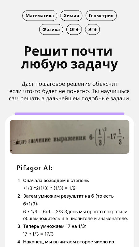 Pifagor is an artificial intelligence that will help you learn faster and get better results. It’s like a solution book and a GDZ, only smarter.
