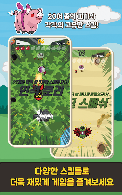 피기들의 다양한 스킬들을 이용해 더 멀리 날아 더 많은 폭탄들을 제거해주세요.