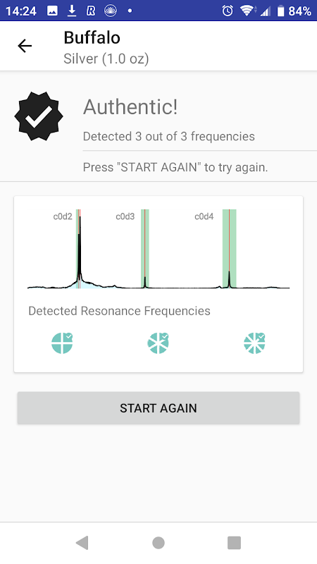 Unlike other apps, Pingcoin shows you the resonance tolerance for each coin. You see your coin's measured frequencies, the expected range, and exactly how close the match is. No black box — just clear, visual verification you can trust.