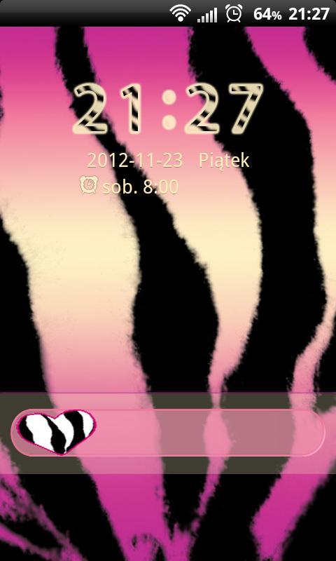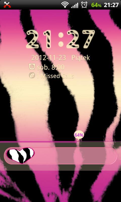 Lock your phone with zebra skin. Motif is in pink and black shades. Font of information texts have cream color. Layout of digital clock is beige and have some little stripes. We have changed alarm, missed call and new message icons. Unlock bar is transparently pink. Unlock button is a grate hearts in stripes.