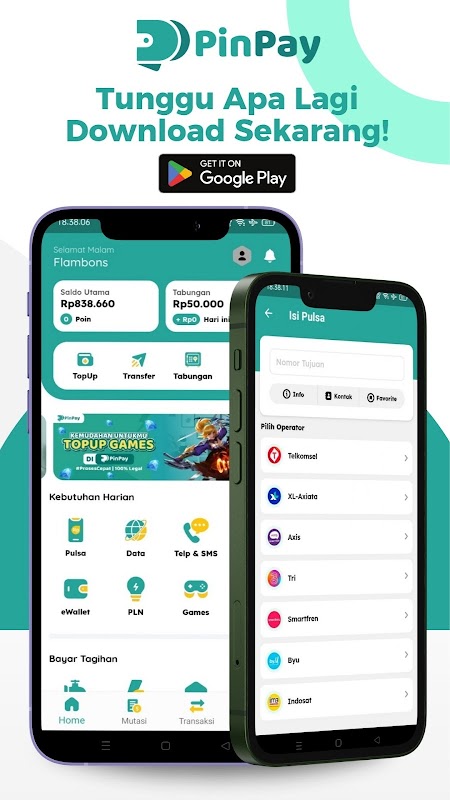 PinPay is an application to meet daily digital transaction needs. Buy credit, data packages, e-wallet top-ups (DANA, OVO, ShopeePay, etc.), electricity tokens and various other services quickly, safely and without any hassle!