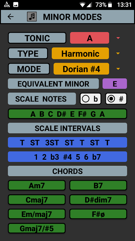 Select a tonic note and a major mode. The app shows you the notes of the scale, the equivalent major scale, its relative minor scale and the chord harmonization.